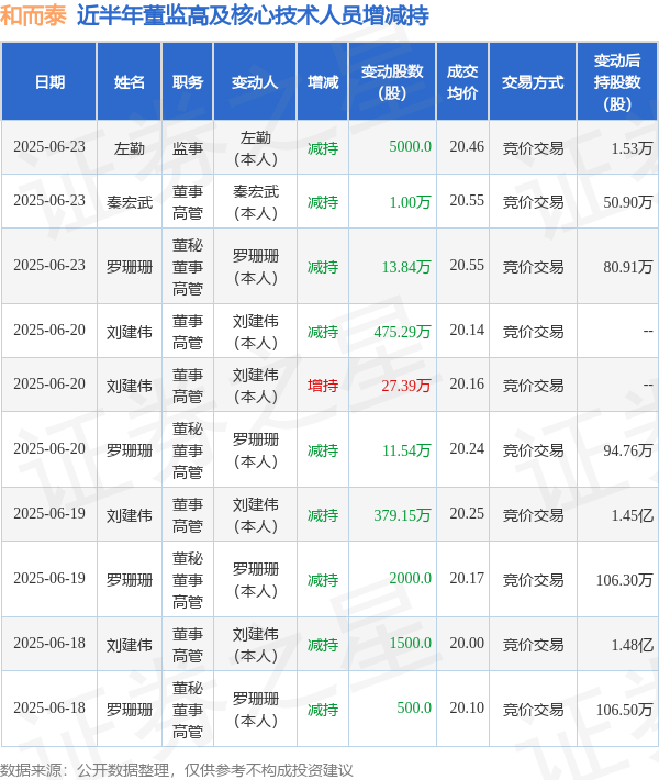 和而泰近半年内的董监高及核心技术人员增减持详情如下: