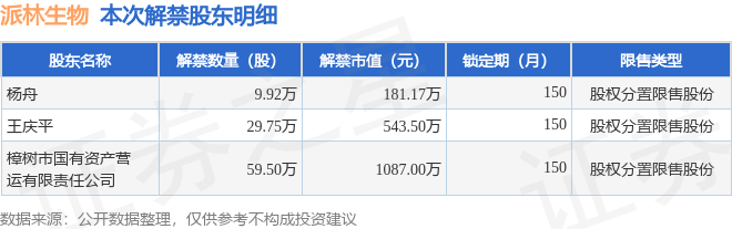 证券之星消息,根据市场公开信息整理,派林生物(000403)于6月25日将有99.16万股限售股份解禁,为公司股权分置限售股份,占公司总股本0.1%。(本次数据根据历史公告整理得出,实际情况以上市公司最新公告为准)最近一年内,该股累计解禁4033.37万股,占总股本的4.24%。本次解禁后,公司还有968.73万股限售股份,占总股本1.02%。具体如下图所示: