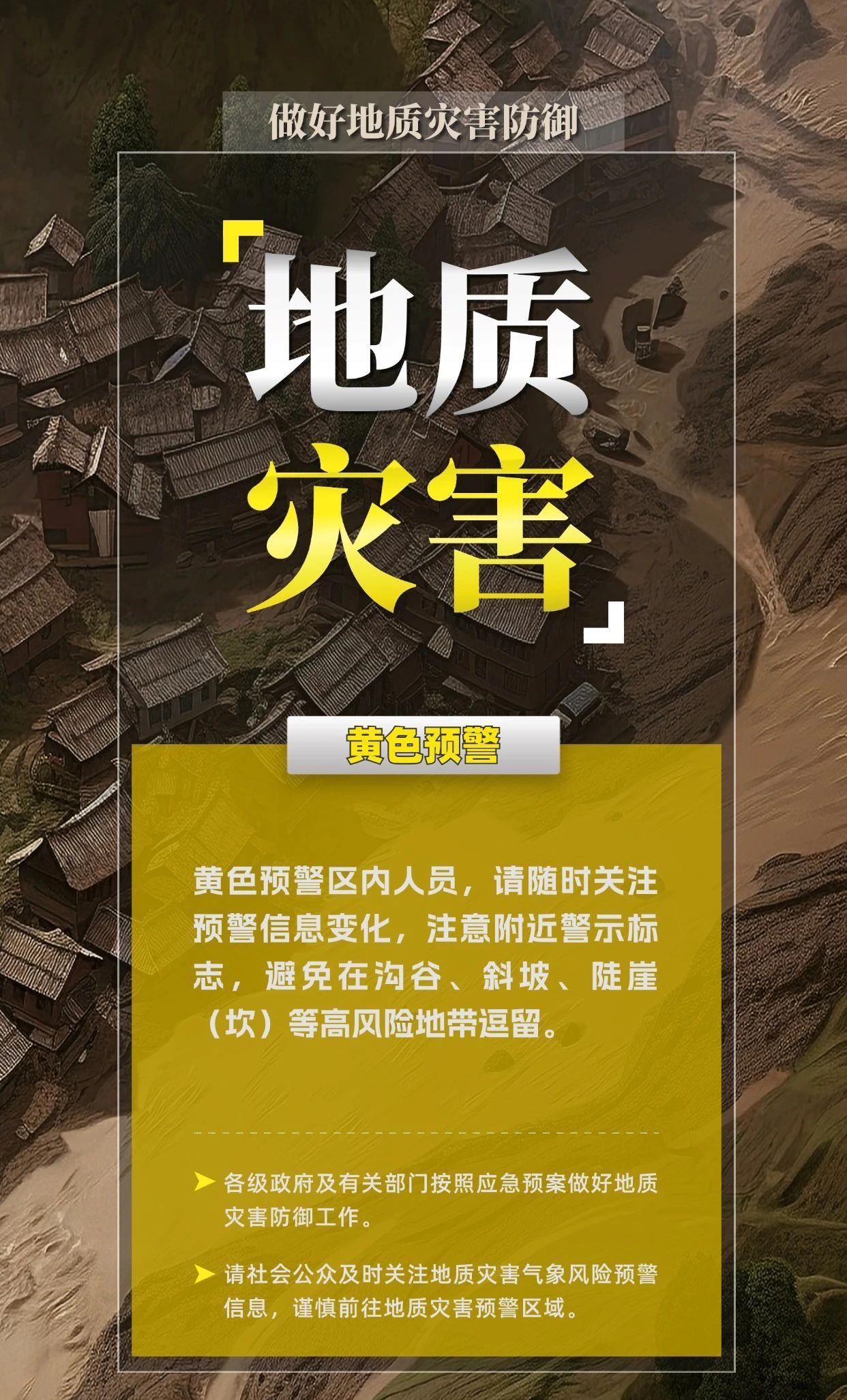黄色预警区内人员,请随时关注预警信息变化,注意附近警示标志,避免在沟谷、斜坡、陡崖(坎)等高风险地带逗留。