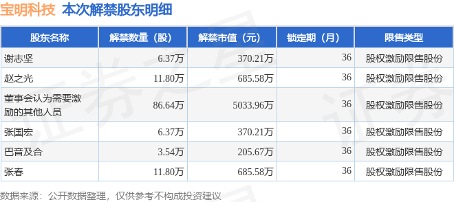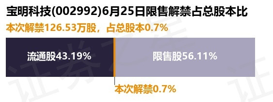 证券之星消息,根据市场公开信息整理,宝明科技(002992)于6月25日将有126.53万股限售股份解禁,为公司股权激励限售股份,占公司总股本0.7%。(本次数据根据历史公告整理得出,实际情况以上市公司最新公告为准)最近一年内,该股累计解禁25.41万股,占总股本的0.14%。本次解禁后,公司还有1.02亿股限售股份,占总股本56.11%。具体如下图所示: