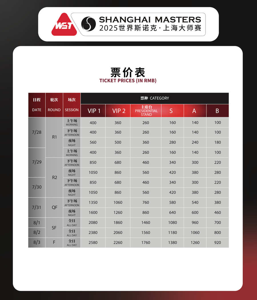 今年,赛事依然分上午场、下午场、夜场和全日进行售票,最低100元即可亲临现场感受中国军团风采。而为了给观众提供更丰富灵活的观赛选择,赛事方在票务产品的设置上也做了进一步优化,推出多重购票福利:购买VIP club产品的观众,除了能获得1号台全程VIP套票、坐拥独家观赛视角外,还可参加赛前的欢迎酒会,让偶遇球员不再是梦想;而“大师体验之旅”“与大师同行”等高端增值服务,则将赛事官方酒店资源与稀有票种结合,搭配闭幕晚宴名额及赛事纪念品礼包等,打造体旅结合的多元消费场景;还有购票赢奥沙利文见面会入场券、指定场次第二张半价等惊喜好礼,让远道而来的球迷朋友们能够感受到别样的斯诺克魅力,留下一份难忘的大师赛回忆。